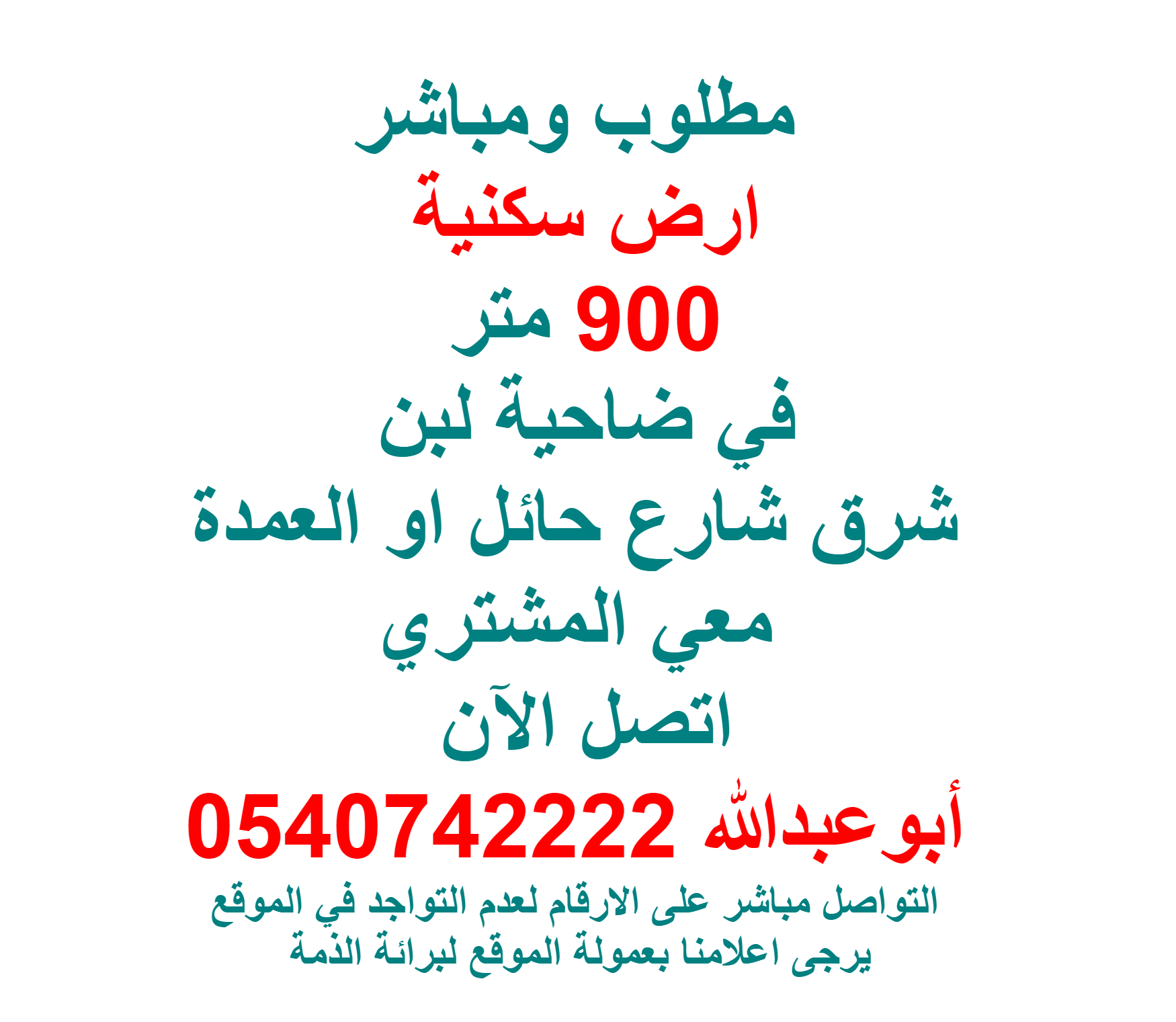 مطلوب ارض سكنية 900 متر ضاحية لبن شارع حائل او العمدة 0540742222