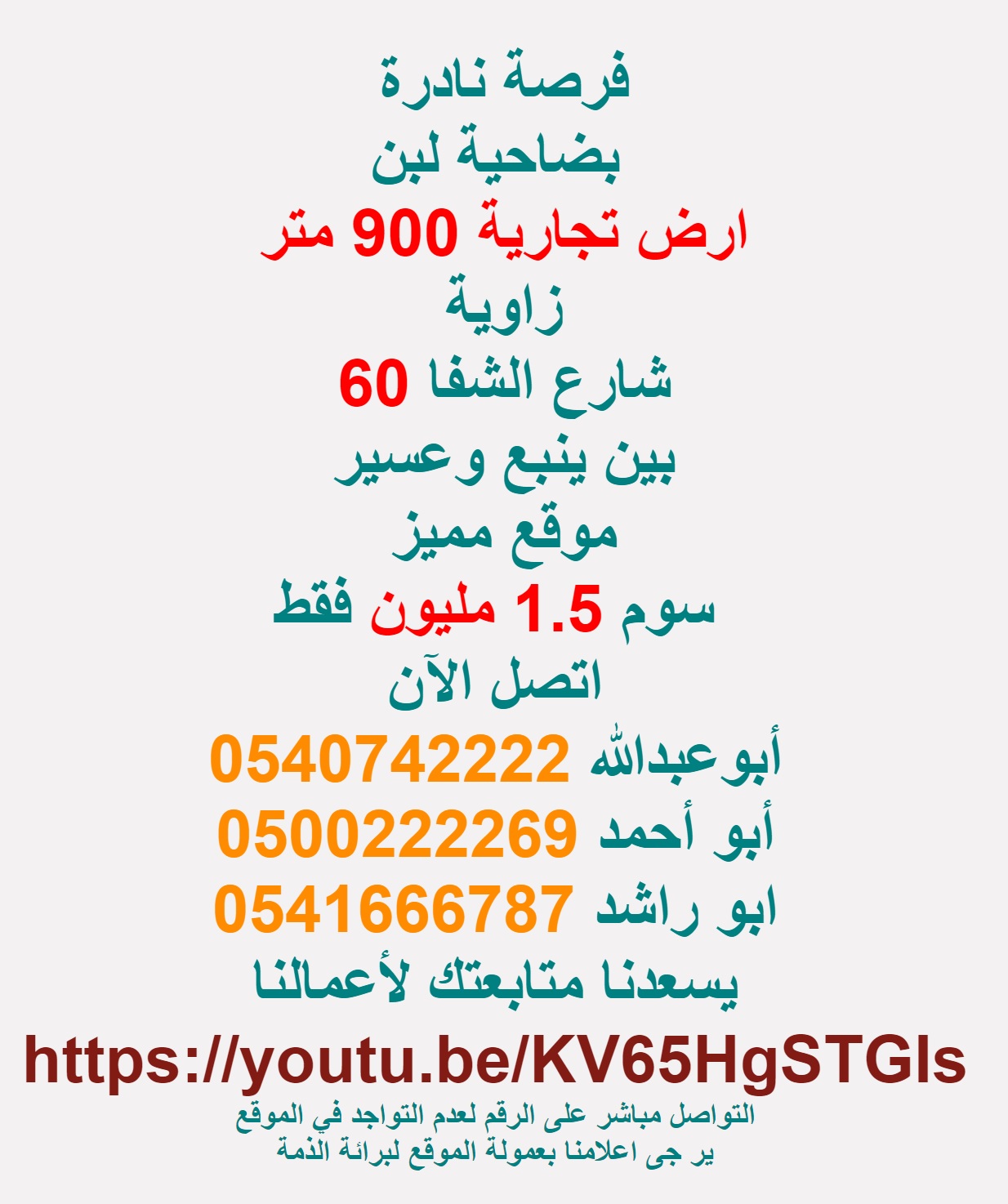 ارض تجارية 900 متر زاوية شارع الشفا 60 بين ينبع وعسير سوم 1.5 مليون 0540742222