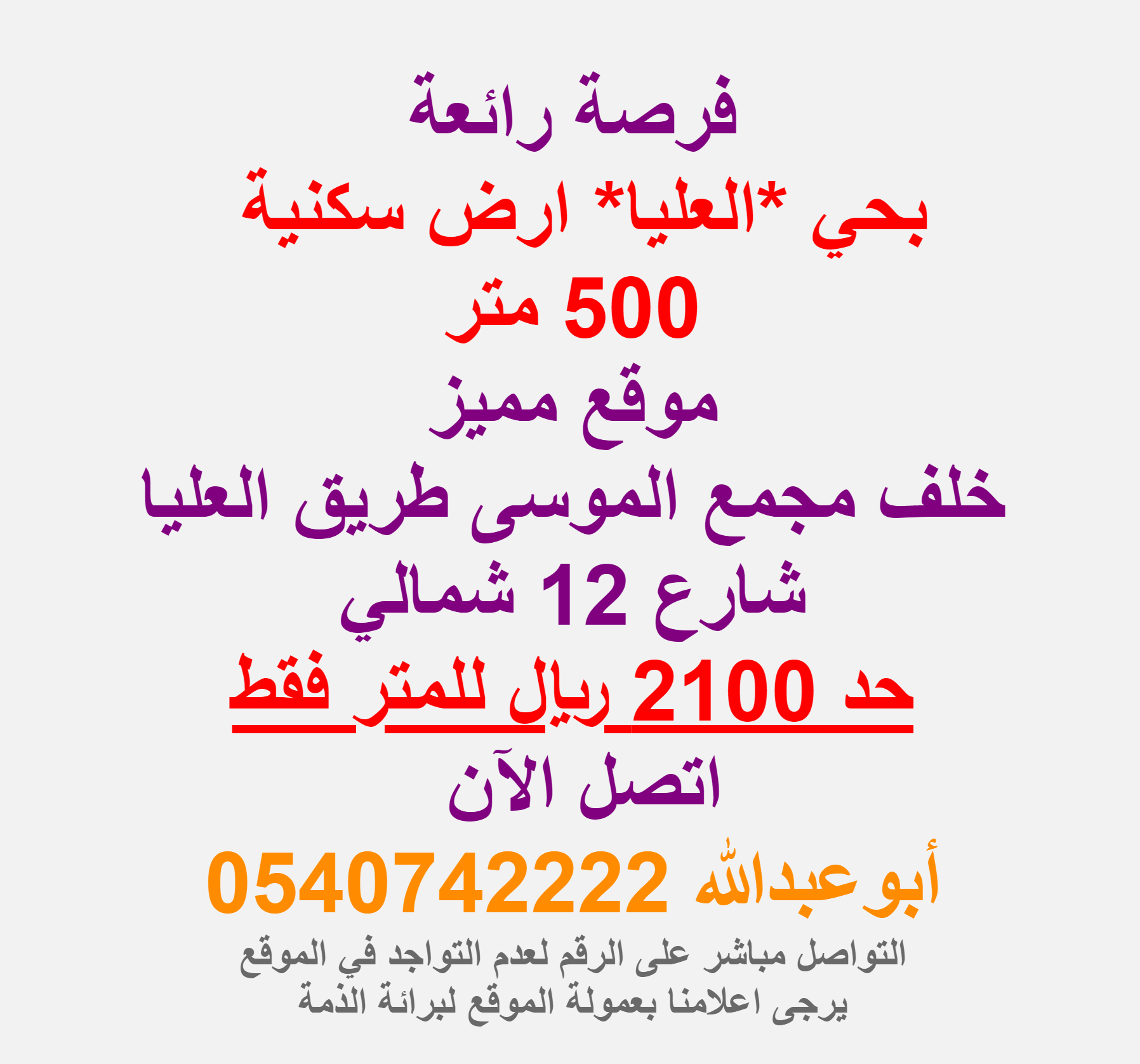 ارض سكنية حي العليا خلف مجمع الموسى شارع 12 شمالي حد 2100 ريال للمتر 0540742222